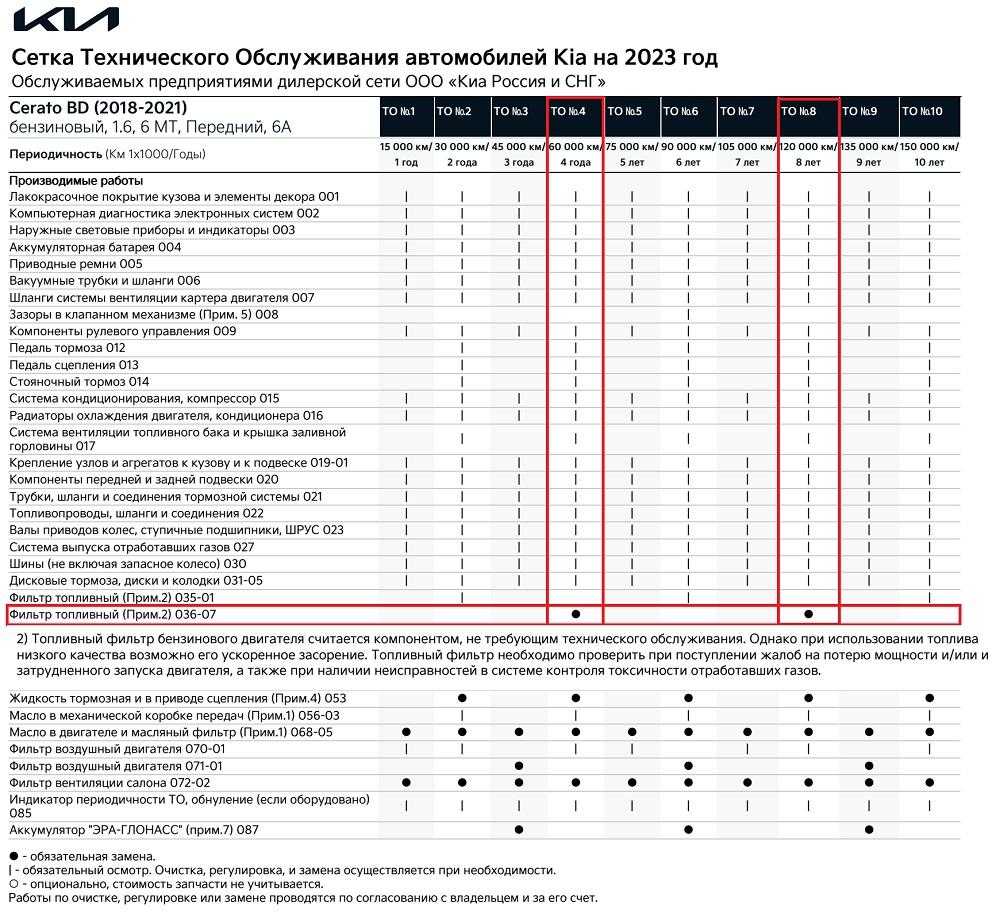 Как часто нужно менять топливный фильтр на Киа Церато 3?
