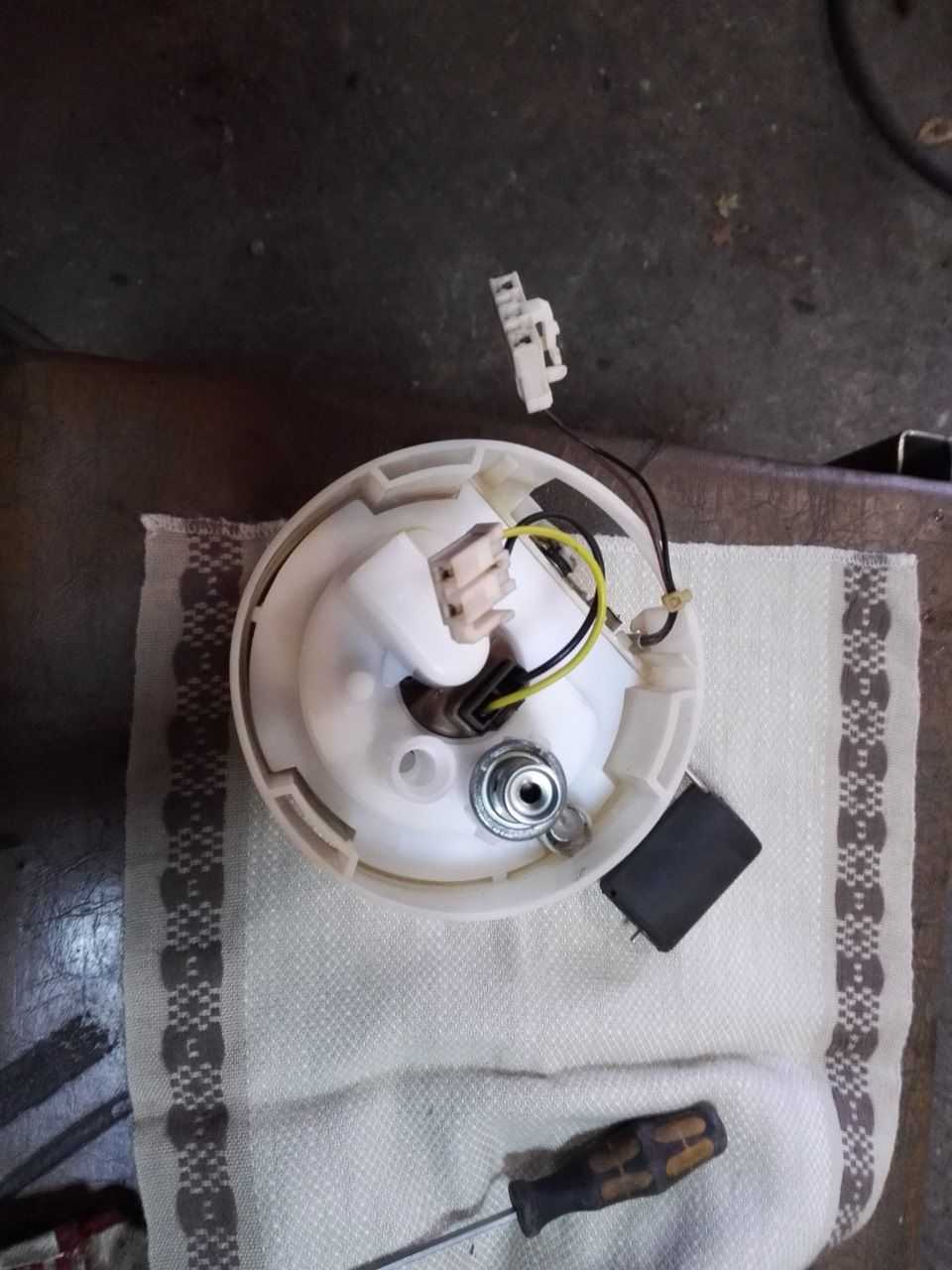 Не спеша отводим защелку из пластика, при этом освобождаем направляющие, чтобы мы могли их извлечь с крышкой. Извлекаем топливоочистительный элемент вместе с насосом из стакана.Отсоединяем минусовый контакт, при этом отвертка остается между кольцом очистителя топлива и защелками моторчика — это предоставит возможность отсоединить его.