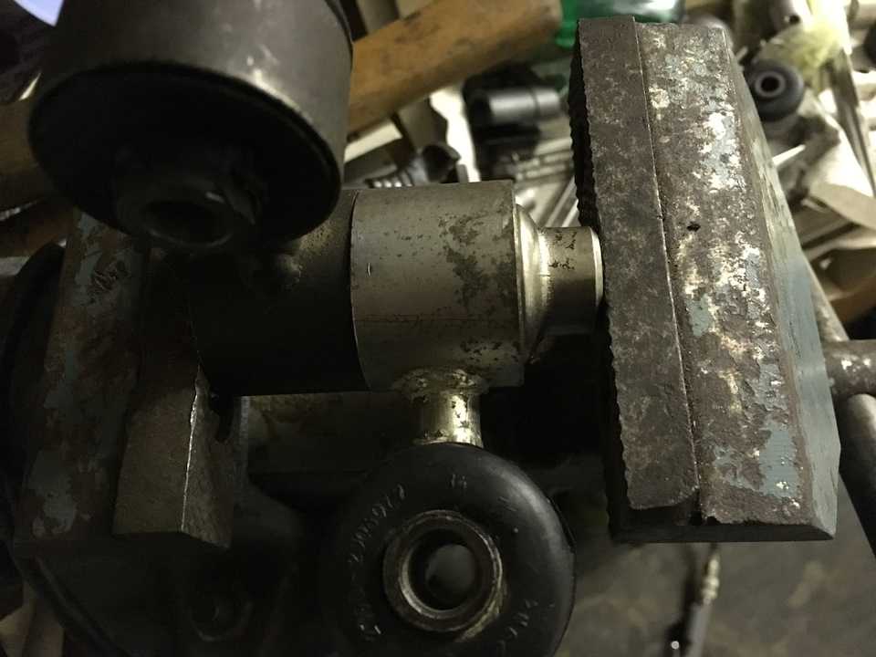 Запресовуется похожим образом, только задавливаем резинку через деревяшку чтобы не попортить об металл тисков, смазав внутрянку немного силиконом.Сядет она конечно не до конца, снимаем с тисков, ставим на наковальню вместе с проставкой из старой стойки и точным ударом резиновой киянки она садится на место, при необходимости подворачиваем краюшек втулки если вдруг облой зажевало при запресовке.