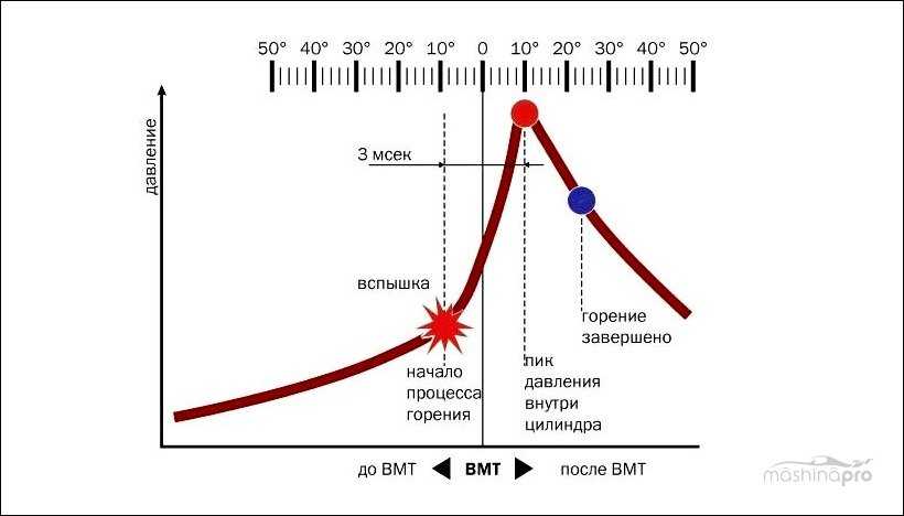 Если установить угол опережения зажигания на 10° перед ВМТ, то воспламенение воздушно-топливной смеси в каждом из цилиндров будет происходить в момент, когда соответствующий поршень займет соответствующее положение (10° перед ВМТ конца своего такта сжатия). Сказанное остается верным лишь во время работы двигателя на холостых оборотах. Добиться максимальной эффективности отдачи двигателя/экономии расхода топлива можно добиться, если процесс сгорания смеси в цилиндрах будет завершаться в пределах 23° после ВМТ соответствующего поршня.