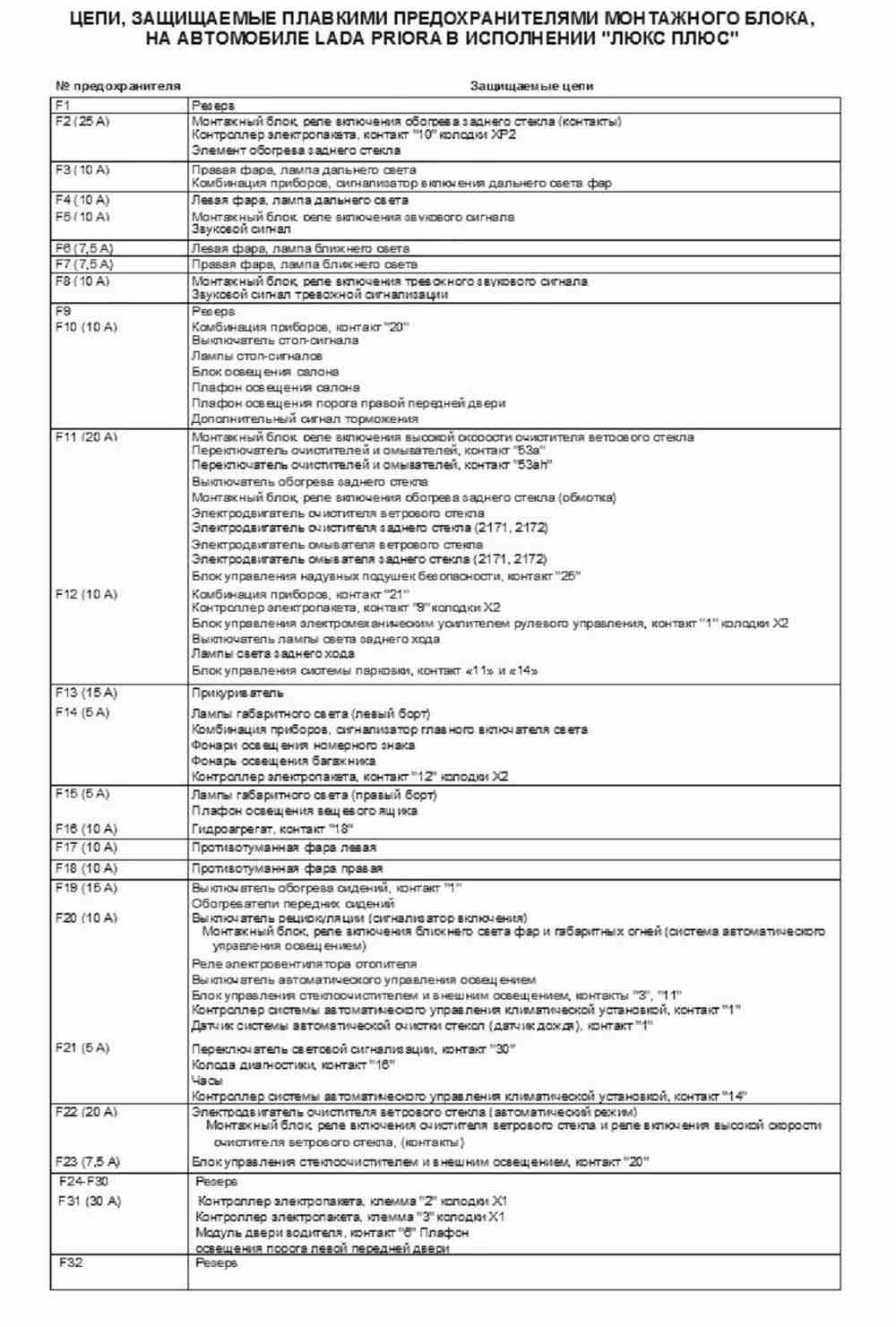 - F32(F28) — 40А — Резерв на Приоре без ABS. На Приоре с ABS: блок ABS системы.