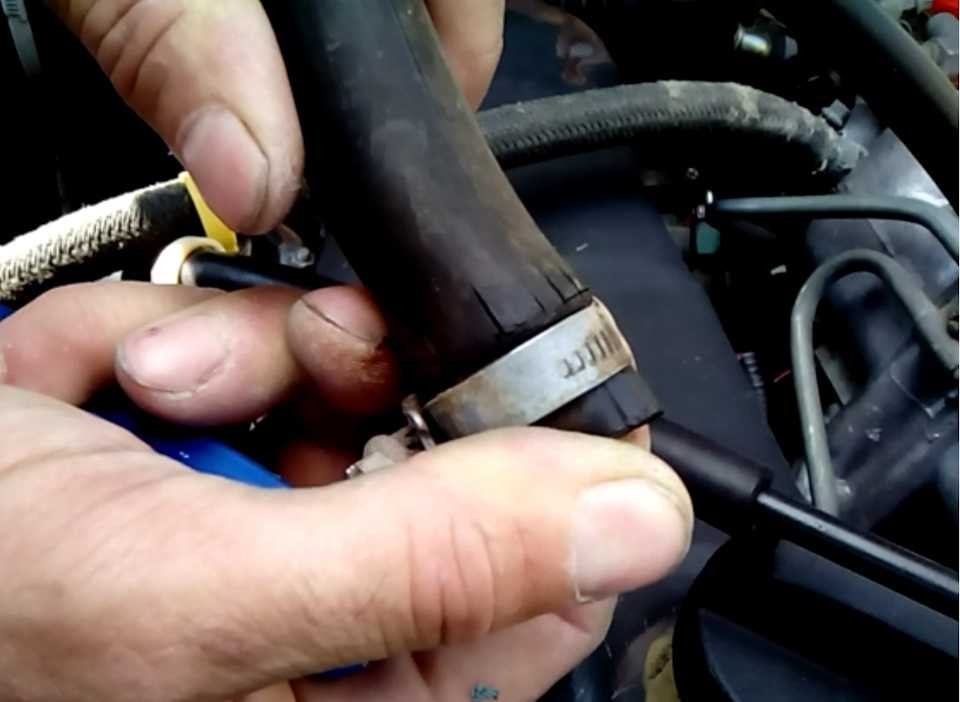 Для начала, ослабляем хомуты крепления шлангов на крышке сапуна и дроссельном узле, снимаем их.