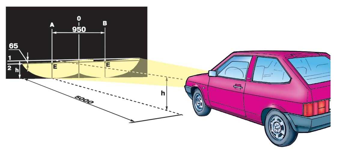 Начертив шаблон с учётом расположения верхней границы пучка (ниже высоты h на 65 мм) и того, чтобы пучки света перекрывались по осевой линии машины (см. рис.), установите авто так, чтобы расстояние от поверхности фар до экрана было 5м. Настройку каждой фары осуществляйте отдельно, для чего отключите разъём проводов «ненужной».