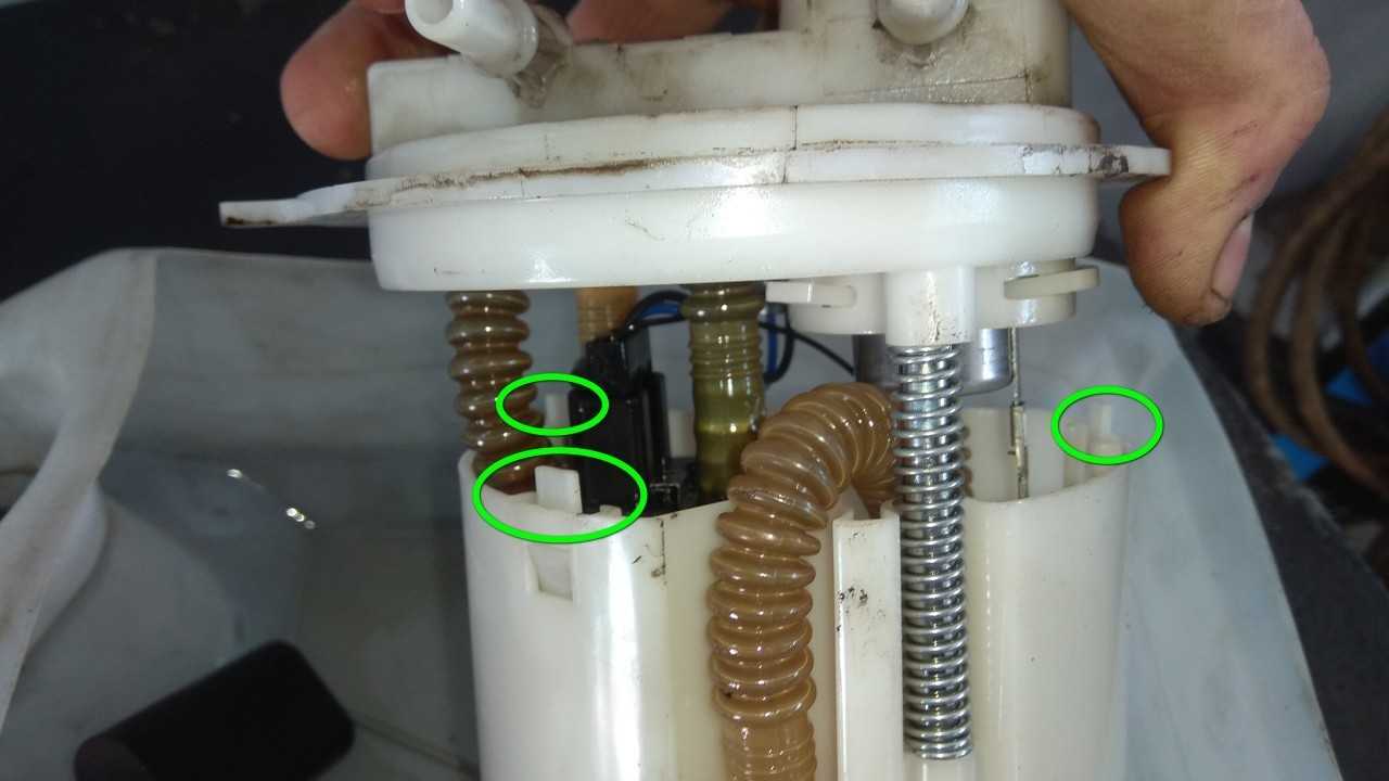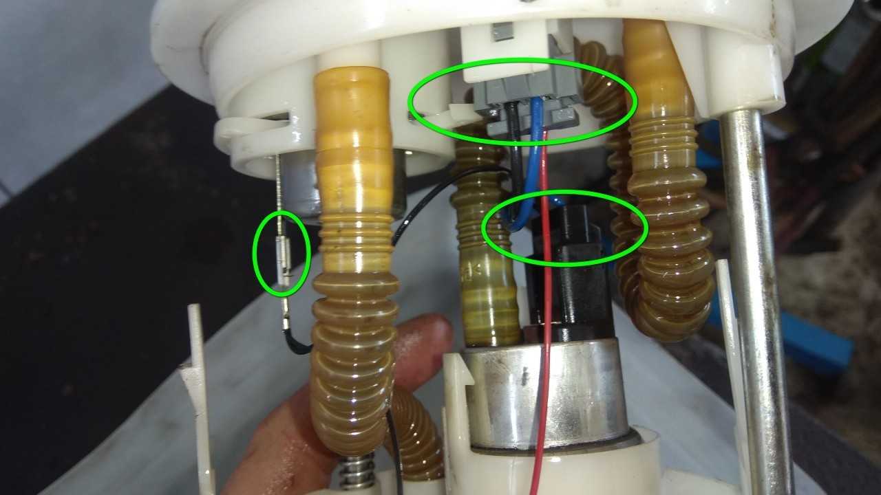 Отсоединяем все провода и электроразъемы указанные на фото. и вытаскиваем внутреннюю часть в которой находится топливный насос.