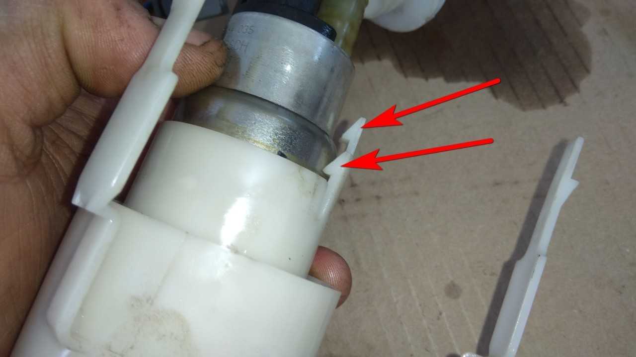 Отгибаем руками два фиксатор топливного насоса и вытаскиваем его из пластика.