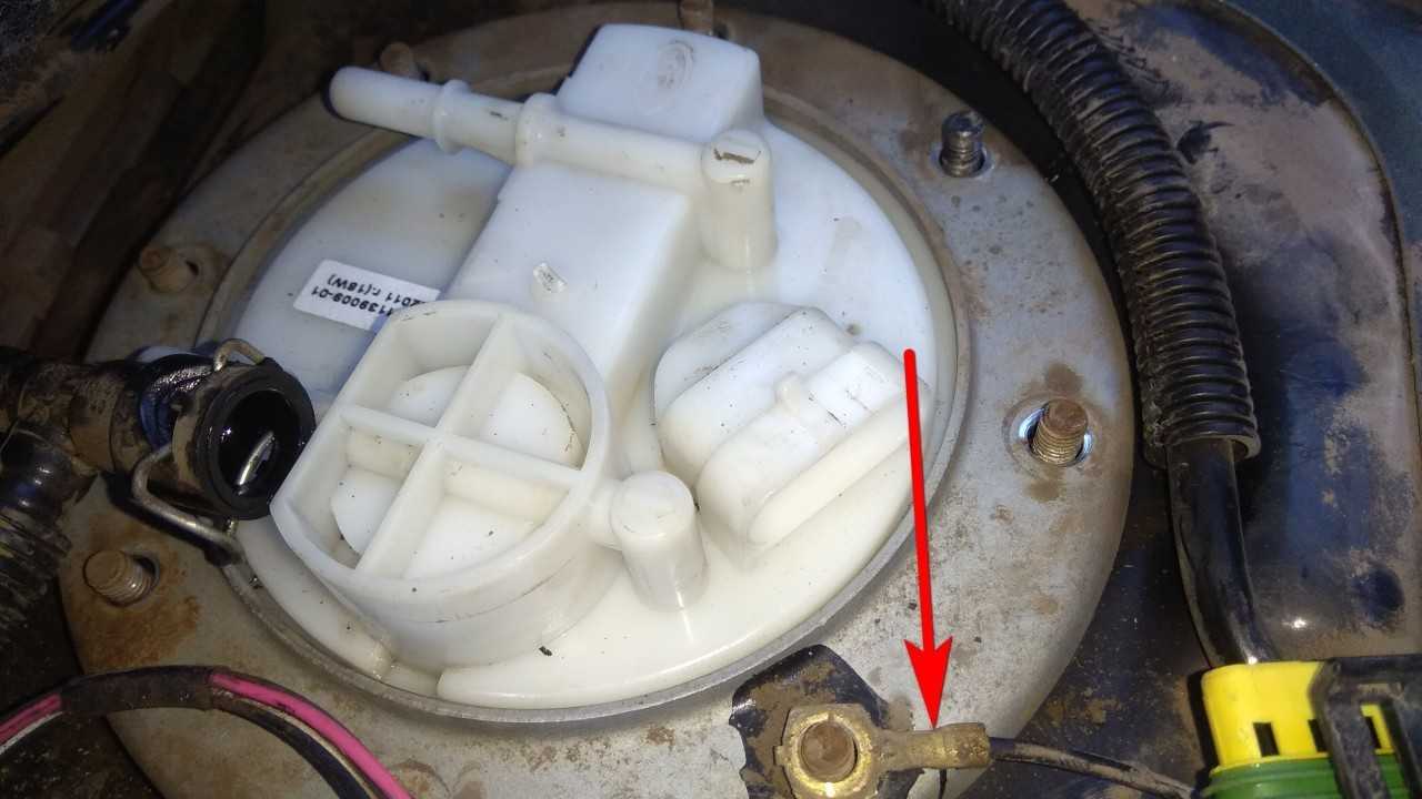 3) Идём дальше и подготовить отвёртку вам нужно будет, при помощи неё выкрутите два винта которые крепят к модулю Датчик Уровня Топлива (см. фото 1) и после чего датчик снимите, затем отсоедините две колодки проводов, одну отсоединить от кронштейна будет нужно, а другую прямо от самого бензонасоса (см. фото 2, у обоих колодок есть фиксаторы которые их крепят, поэтому вы их отогнуть не забудьте и нажать тоже, просто какой то фиксатор нужно будет отгибать, а какой то отжимать, в общём разберётесь, если что видео-ролик в самом низу посмотрите), затем повторно воспользовавшись отвёрткой отсоедините сеточку (По научному это фильтр грубой очистки) от топливного модуля (Отсоединяется она очень легко, отвёрткой её поддеваете в том месте где она к модулю крепить и тем самым снимаете её с него), кстати в данной сеточке есть ещё стопорная шайба которую отвёрткой извлечь после снятия сеточки нужно будет (см. фото 3), ну и в завершение сам корпус с бензонасосом снимите, для этого фиксирующий шплинт выньте (Рукой или пассатижами его вынуть можно) и преодолевая усилия пружин снимите корпус с бензонасосом по направляющим (см. фото 4, для наглядности корпус который вы должны снять указан стрелкой).