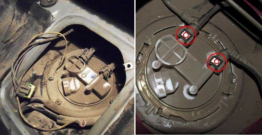 Вы увидите верхушку топливного модуля, а поверх него – несколько проводов. Отожмите фиксатор, который удерживает жгут, отсоедините провода от модуля. Также к крышке узла системы топливоподачи подведены два маленьких шланга. Один отвечает за подачу бензина, другой – за отправку.