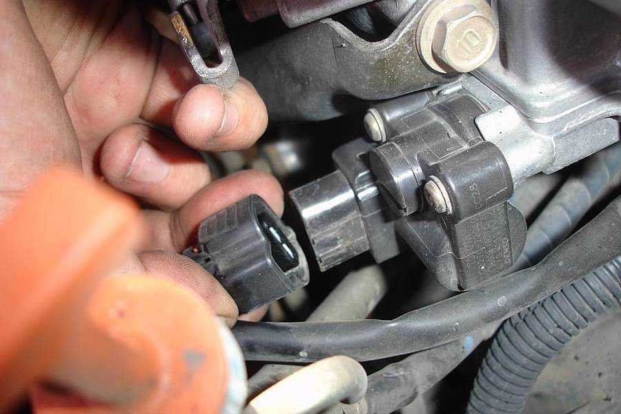 - Найдите место расположения датчика. Разыщите контактную фишку с проводами. Нажмите и удерживайте 2 пластиковых, крепежных фиксатора расположенных по обеим сторонам фишки. Вытяните колодку из разъема датчика.