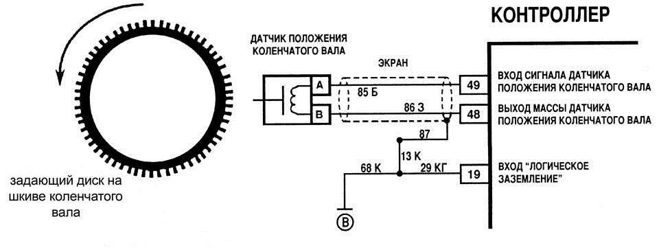 Коль скоро стоит задача вычислить положение коленвала, то к нему крепят диск-синхронизатор, который может быть совмещен с маховиком сцепления или со шкивом на переднем торце коленвала. Поскольку сердечник намагничен, то он реагирует импульсом на любое движение у его поверхности металлического предмета. Такими предметами стали зубья шкива коленвала. При вращении коленвала, маховик или шкив мелькают перед датчиком зубьями, постоянно генерируя электрические импульсы. Эти импульсы подаются на электронный блок управления и на основе их частоты блок вычисляет момент подачи искры. Только если бы импульс был бы постоянным, никакой возможности выяснить истинное положение коленвала было бы невозможно. Следовательно, нужно удалить один или несколько зубьев, чтобы электронный блок управления понимал, что пропуск в потоке импульсов и есть тем самым положением коленвала, когда нужно подавать искру на свечи. К примеру, на Газели и на Волге на шкиве коленвала находилось бы 60 зубьев, но два из них вырезаны, чтобы сообщить ЭБУ о верхней мертвой точке на первом и на четвертом цилиндрах. На самом же деле, поршень находится в ВМТ тогда, когда возле датчика пролетает пик двадцатого зуба, считая от вырезанных.