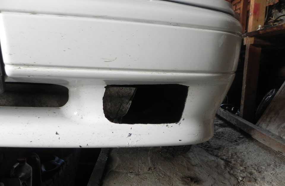 Как писалось выше, у вас есть два варианта – либо ставить новый бампер с готовыми вырезами под ПТФ, либо резать лобзиком самому. Для этого снимаем бампер, размечаем посадочные отверстия, режем лобзиком.