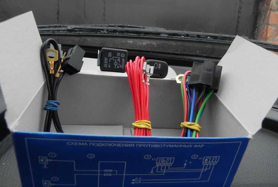 В набор для подключения противотуманок должны входить провода с клеммами и разъёмами, реле, кнопка