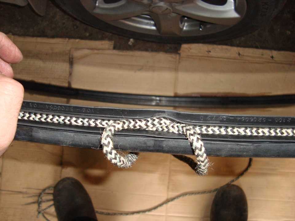Установка лобового стекла продолжается с того, что требуется воспользоваться шнуром или веревкой, которую необходимо вложить в наружный разрез уплотнителя. Веревка всовывается по периметру всего уплотнителя, а соединение должно получиться в нижней части. При этом, требуется концы веревки перехлестнуть, а затем закрепить, как показано на фото ниже.