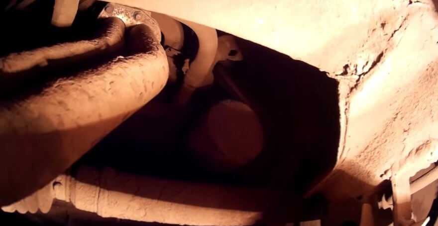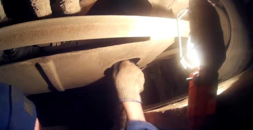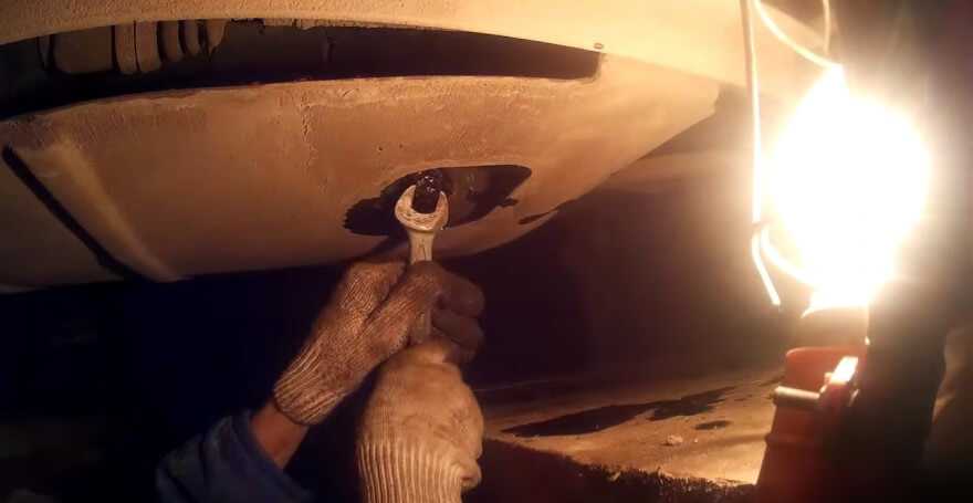 Прогреваем двигатель и загоняем автомобиль на смотровую яму. Находим пробку сливного отверстия, откручиваем ее ключом.