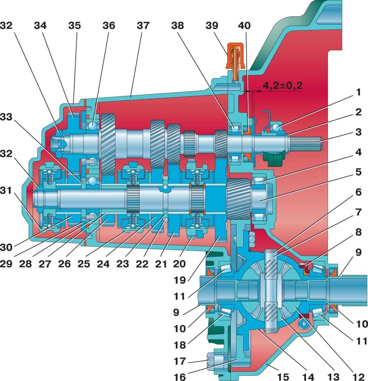 Рис. 3.7. Коробка передач: 1 – подшипник выключения сцепления; 2 – направляющая втулка; 3 – первичный вал; 4 – роликовый подшипник вторичного вала; 5 – вторичный вал; 6 – стопорное кольцо; 7 – ось сателлитов; 8 – ведущая шестерня привода спидометра; 9 – заглушка транспортная; 10 – сальник привода колеса; 11 – роликовый конический подшипник дифференциала; 12 – шестерня полуоси; 13 – сателлит; 14 – коробка дифференциала; 15 – картер сцепления; 16 – ведомая шестерня главной передачи; 17 – пробка сливного отверстия; 18 – регулировочное кольцо; 19 – ведомая шестерня I передачи вторичного вала; 20 – синхронизатор I и II передачи в сборе; 21 – ведомая шестерня II передачи вторичного вала; 22 – стопорное кольцо; 23 – упорное полукольцо; 24 – ведомая шестерня III передачи вторичного вала; 25 – синхронизатор III и IV передачи в сборе; 26 – ведомая шестерня IV передачи вторичного вала; 27 – игольчатый подшипник шестерен вторичного вала; 28 – шариковый подшипник вторичного вала; 29 – упорная пластина; 30 – ведомая шестерня V передачи вторичного вала; 31 – синхронизатор V передачи в сборе; 32 – гайка; 33 – упорная шайба; 34 – ведущая шестерня V передачи первичного вала; 35 – задняя крышка картера коробки передач; 36 – шариковый подшипник первичного вала; 37 – картер коробки передач; 38 – роликовый подшипник первичного вала; 39 – сапун; 40 – сальник первичного вала |