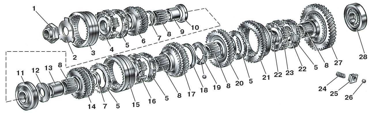 Рис. 3.14. Детали вторичного вала: 1 – гайка; 2 – упорная пластина; 3 – скользящая муфта синхронизатора V передачи; 4 – ступица скользящей муфты; 5 – блокирующее кольцо синхронизатора; 6 – шестерня V передачи; 7 – дистанционное кольцо игольчатого подшипника; 8 – игольчатый подшипник; 9 – втулка шестерни V передачи; 10 – упорная шайба; 11 – шариковый подшипник; 12 – упорная шайба; 13 – втулка шестерни IV передачи; 14 – шестерня IV передачи; 15 – скользящая муфта синхронизатора III и IV передач; 16 – ступица скользящей муфты; 17 – шестерня III передачи; 18 – стопорное кольцо; 19 – упорные полукольца вторичного вала; 20 – шестерня II передачи; 21 – скользящая муфта синхронизатора I и II передач с зубчатым венцом заднего хода; 22 – стопорное кольцо ступицы синхронизатора; 23 – ступица скользящей муфты синхронизатора I и II передач; 24 – пружина синхронизатора; 25 – сухарь; 26 – фиксатор; 27 – шестерня I передачи; 28 – роликовый подшипник |