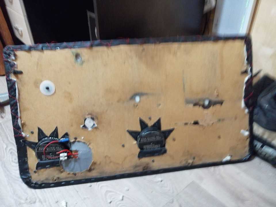 - С тыльной стороны проделать шилом отверстия, вырезать вход для ручек, подлокотника, динамиков.