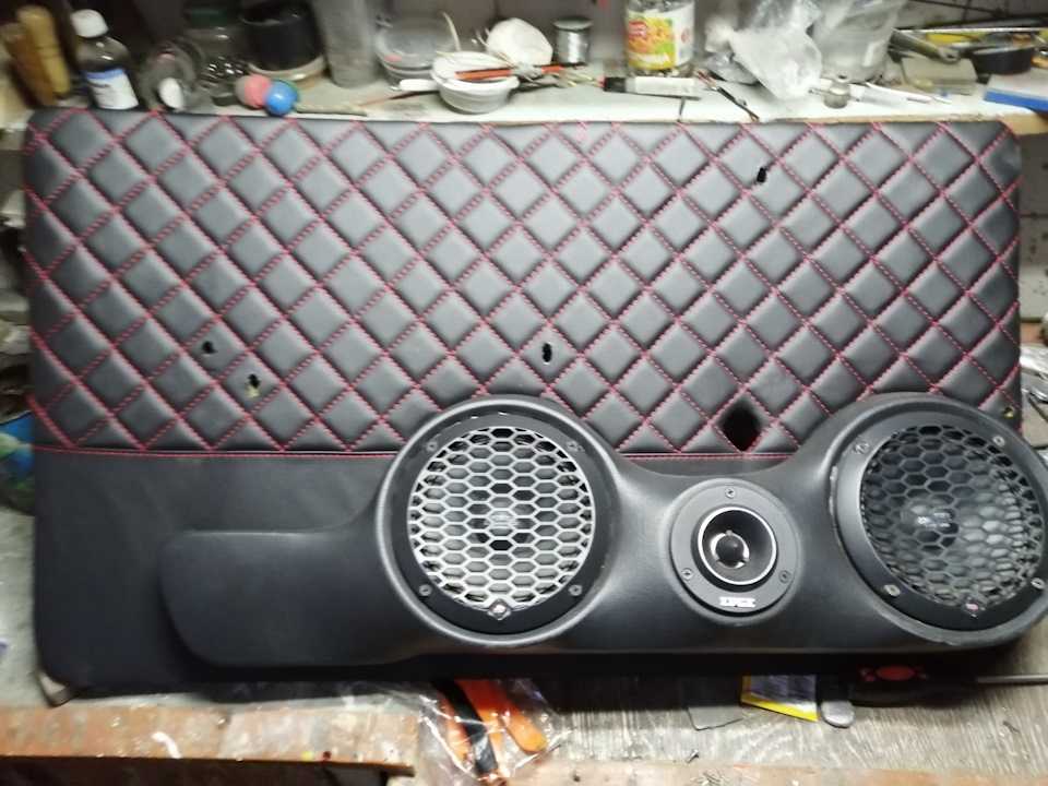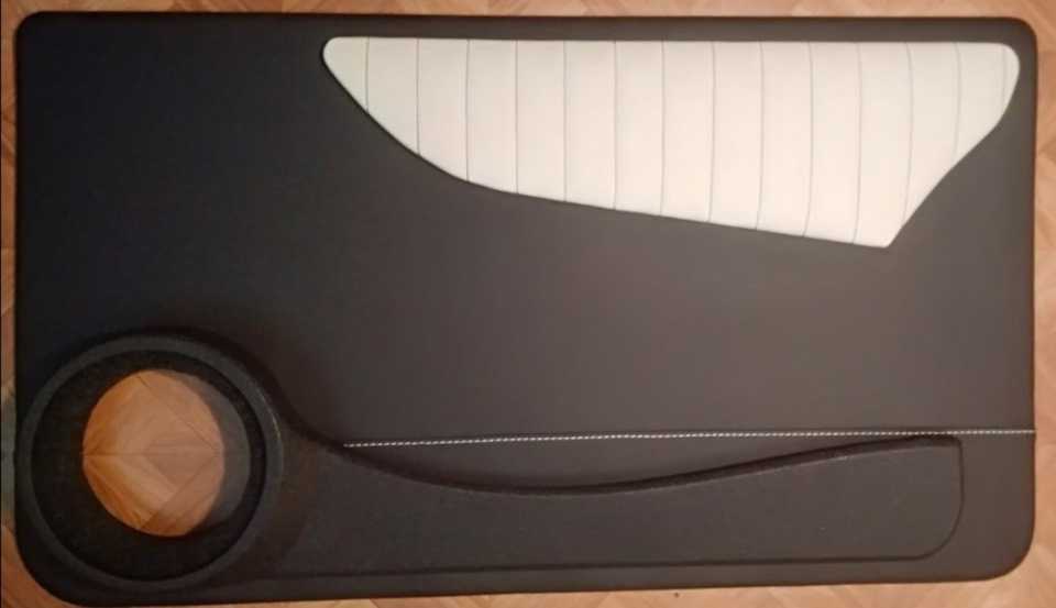 Не составит большого труда вырезать «новые» заготовки для наших будущих дверных при помощи электро-лобзика или других подручных инструментов. Контур и разметку всех необходимых отверстий очень удобно перенести со «старых» дверных карт при помощи наложения. Сделать это нужно крайне тщательно — все отверстия должны совпасть с ответными частями на двери автомобиля (ручки открывания, ручки салона, ручки стеклоподъёмника, установочных «клипс». Кроме того, если вы решили установить динамики в двери, то самое время вырезать установочные отверстия для них. Лучше с небольшим запасом, что бы потом не пришлось переделывать. Рекомендуемые диаметры установочных отверстий в дверных картах — не менее 75 мм под высокочастотные динамики, не менее 145 мм под 16-е динамики, не менее 185 мм под 20-е динамики. Более точные цифры есть в инструкциях всех акустических элементов