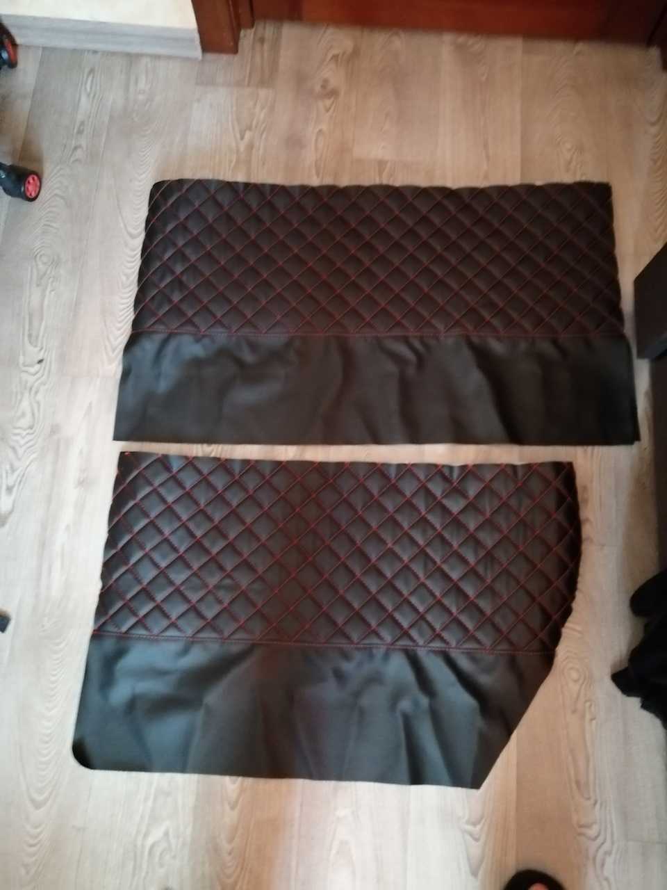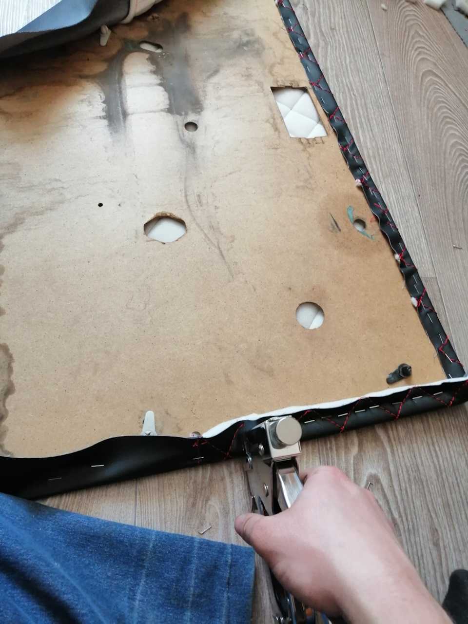 Обшить панель можно цельным или сшитым куском выбранного материала. Если обшивка состоит из двух или более кусков, необходимо проследить, чтобы отверстия не вырезались по линии машинной строчки. Обрезать выкройку необходимо, оставляя припуск по периметру до 5 см. Винил кожа, алькантара значительно деформируются при усадке. Ворс в текстильной обивке нельзя заворачивать, когда прорезаются отверстия под ручки.