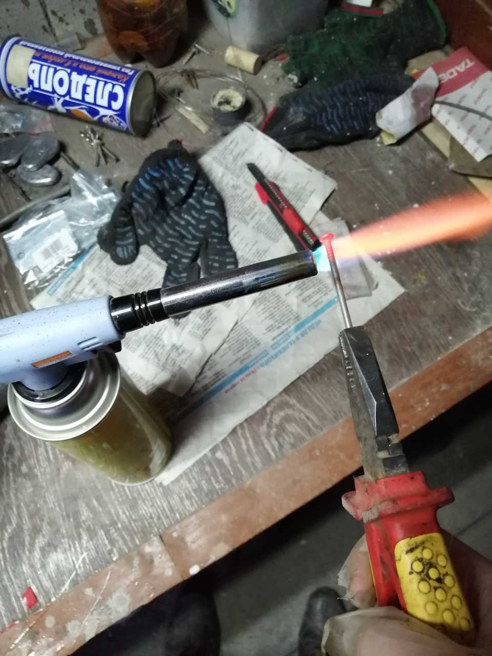 Теперь нужно было проделать отверстия под болты ручки. Делал гвоздём и гарелкой.