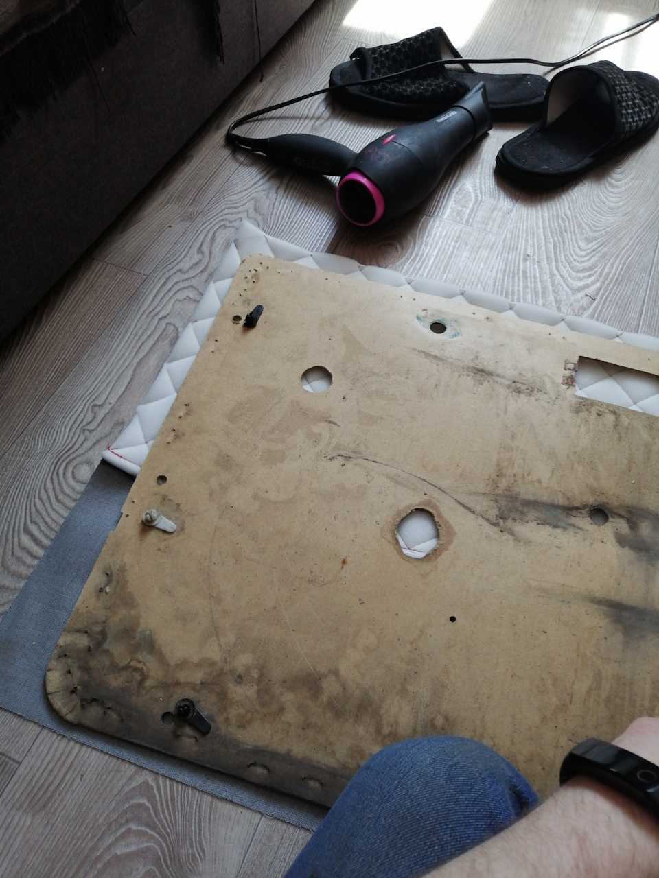 После наклейки подложки ее надо обрезать по размеру фанерного основания и прорезать в ней отверстия под крепление дверной ручки, динамики и ось рукоятки стеклоподъемника.