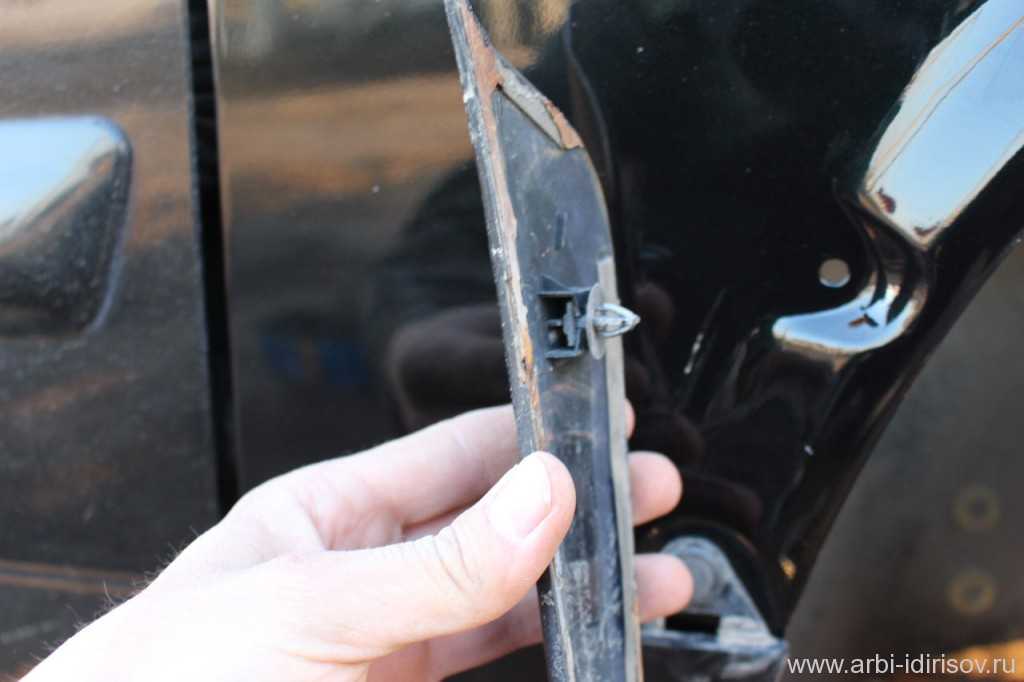 После того как всё открутили, нам нужно открутить все болты крепящие крыло — это болт под порогом, под бампером, два болта под крылом ближе к двери и болты сверху под капотом. И да, не забываем снять повторитель поворотов с крыла, там всё просто — он на защёлках.