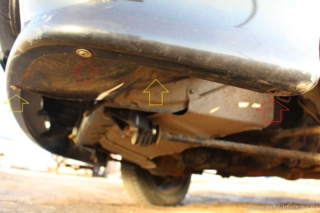 - Откручиваются две гайки в креплении бампера, а затем край самого бампера опускается вниз.