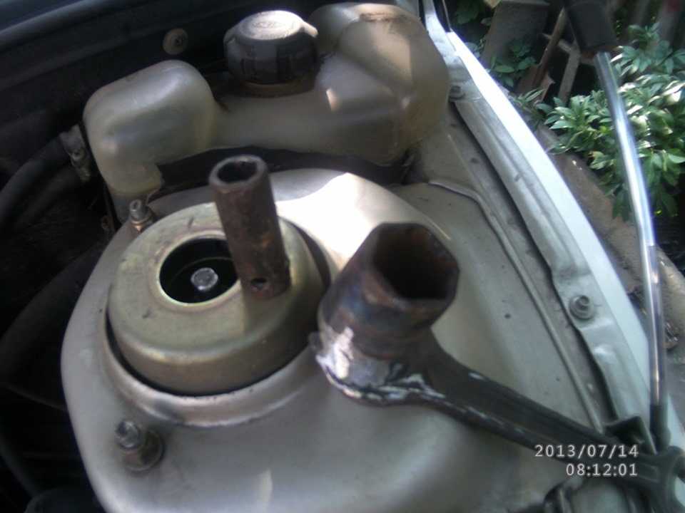 - Под капотом находится три гайки крепления верхней опоры к кузову. Открутите их (ключ на 13).
