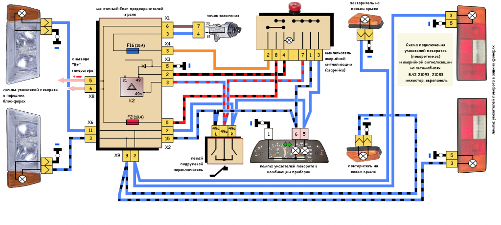 Указатели поворота (поворотники) автомобиля ВАЗ 21093, 21083 инжектор, европанель, схема подключения