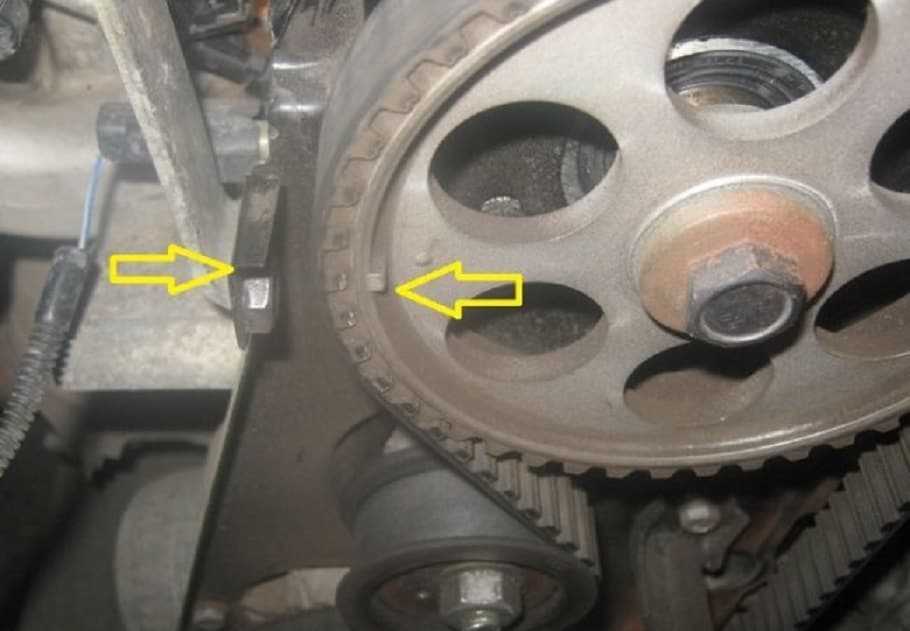 - На шестеренке распредвала вы можете увидеть отметку, она выполнена в виде прямоугольного выступа на краю. При выполнении работ надо, чтобы данная метка совпадала с выступом, расположенным на креплении кожуха ремешка. Если эти отметки не совпадают, необходимо проворачивать колесо до того момента, пока они не совпадут.