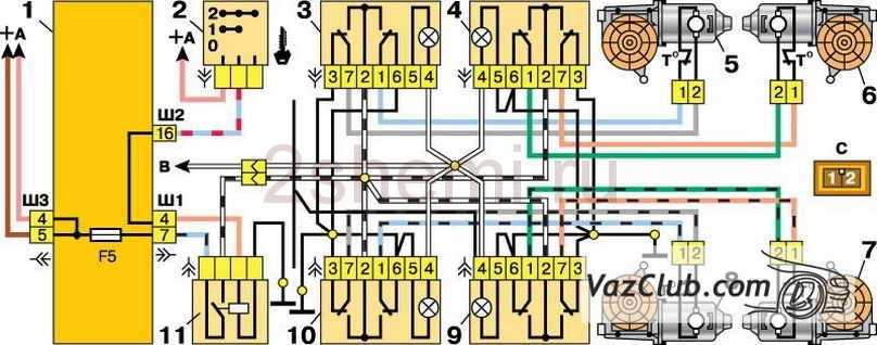 1 – монтажный блок; 2 – переключатель электростеклоподъемника правой передней двери; 3 – моторедуктор электростеклоподъемника правой передней двери; 4 – моторедуктор электростеклоподъемника левой передней двери; 5 – переключатель электростеклоподъемника левой передней двери; 6 – выключатель зажигания; К5 – реле включения электростеклоподъемников; А — к источникам питания; В — к выключателю наружного освещения.