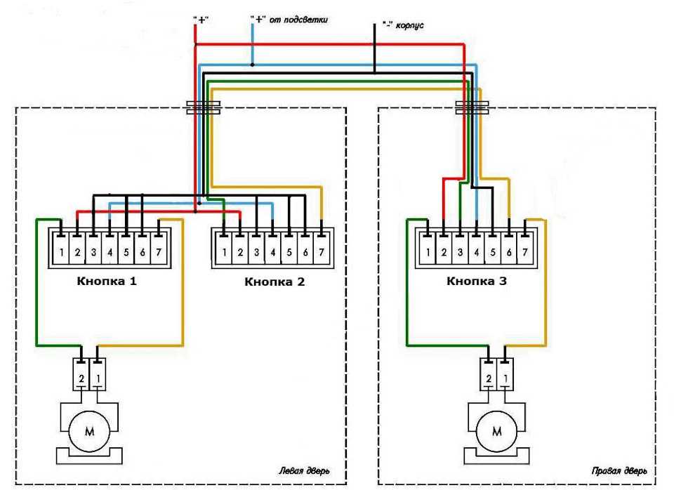 Дополнительно необходимо взять еще два провода, при помощи которых кнопку подсоединить к мотору электростеклоподъемника. Дублирующие кнопки также нужно обязательно дополнить двумя 5-ти контактными реле на схеме их нет.