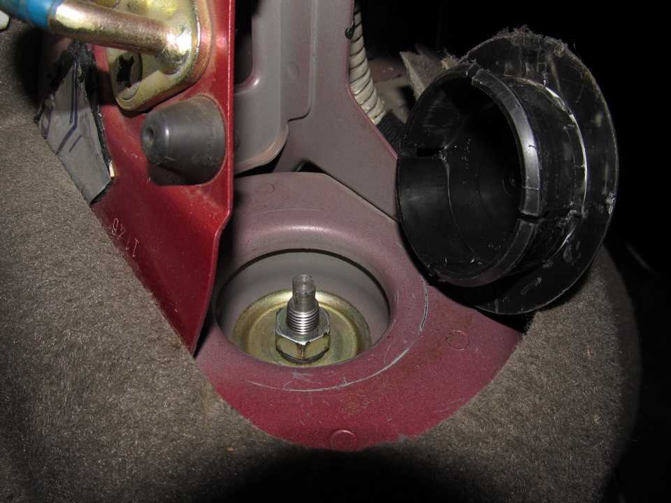 - Полностью выкручиваем гайку крепления штока амортизатора и снимаем опору (после этого можно проверить работоспособность амортизатора, проверить состояние пыльника и отбойника).