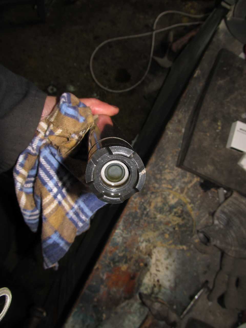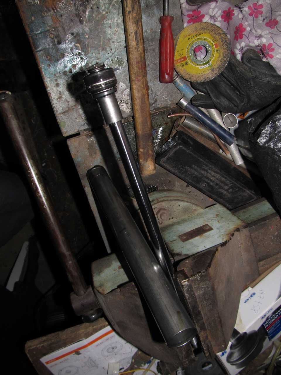 А теперь самое интересное. Сравнение стоек. Я специально сжал чток, чтоб показать, на сколько правая стойка была кончена. Шток свободно опускался без особых усилий на 7 см. У левой стойки всего на 1см был провал.