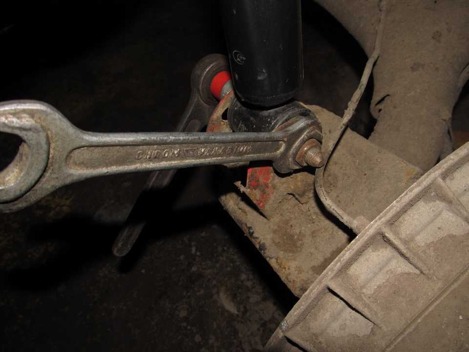 Стягиваем пружину спец.стяжками, чтоб можно было без особых усилий снять и поставить стойку на свое законное место. Теперь стойку откручиваем Нижнее крепление стойки ключом на 19. WDшка конечно же в помощь )))С левой стороны без особых усилий удалось вытащить крепежный болт