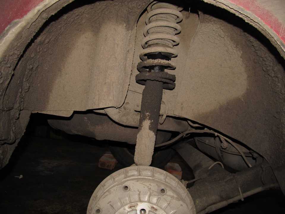 - При визуальном осмотре, если вы увидите что стойка мокрая на сухой дороге, это значит, передней амортизатор потерял свою герметичность. Масло из него вытекает наружу.
