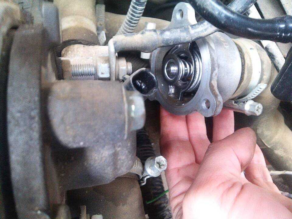 Далее производим установку термостата на его место в обратном порядке, относительно разбора. Вообще, основная проблема в работе по замене данного узла, заключается в правильной заливке тосола, чтобы избежать воздушных пробок. Поэтому заполнив малый круг тосолом, запустите двигатель, это позволит прокачать жидкость, в этот момент доливайте ее до нужного уровня.