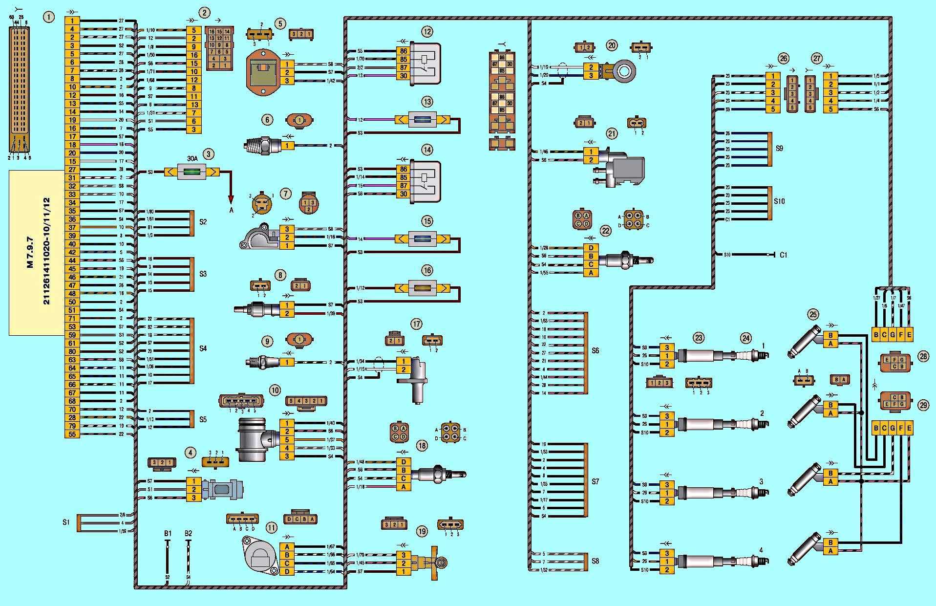 Электросхема ЭБУ двигателя системы М7.9.7 ВАЗ 2170, 21728 Приора