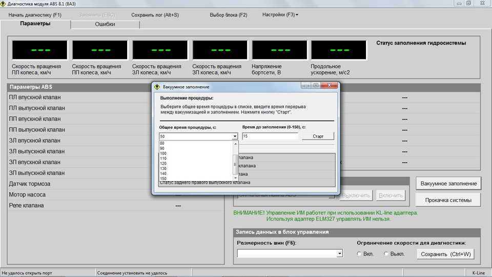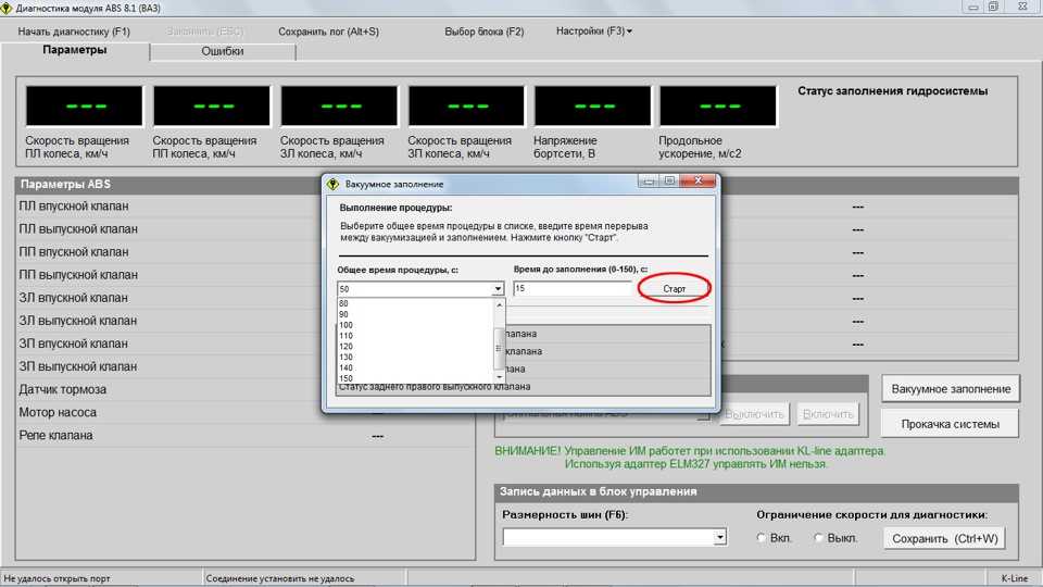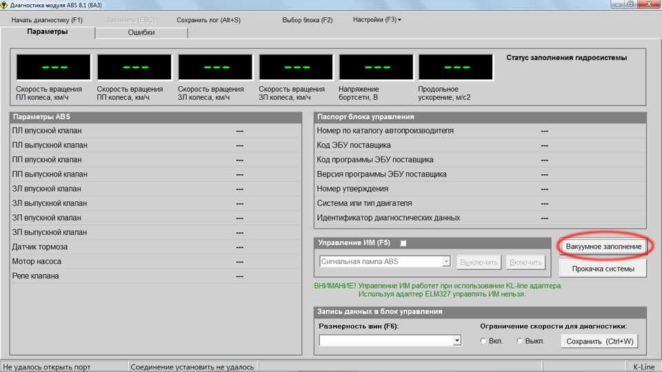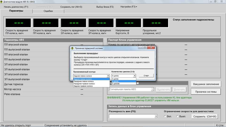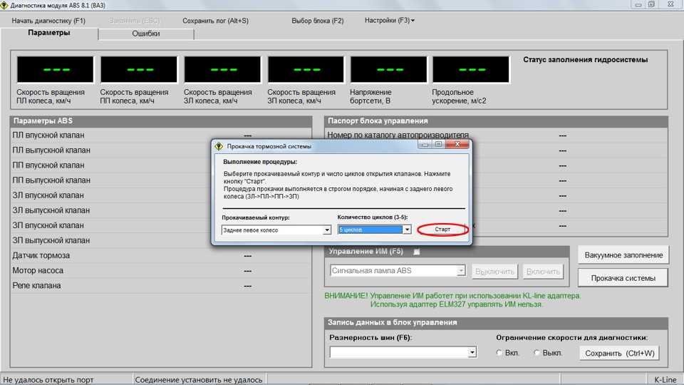 Если же заполнение завершено с ошибкой повторите процедуру второй раз. При удачном завершении закройте клапан прокачки.После этого переходим не посредственно к прокачки тормозов. При прокачки уже ненужно подавать давление в бочек. Прокачку тормозной системы по правилам делают 3 человека. Первый садится за руль, второй следит за уровнем тормозной жидкости, а третий по указаниям первого открывает и закрывает штуцер прокачки.Кликните в программе «Прокачка системы».