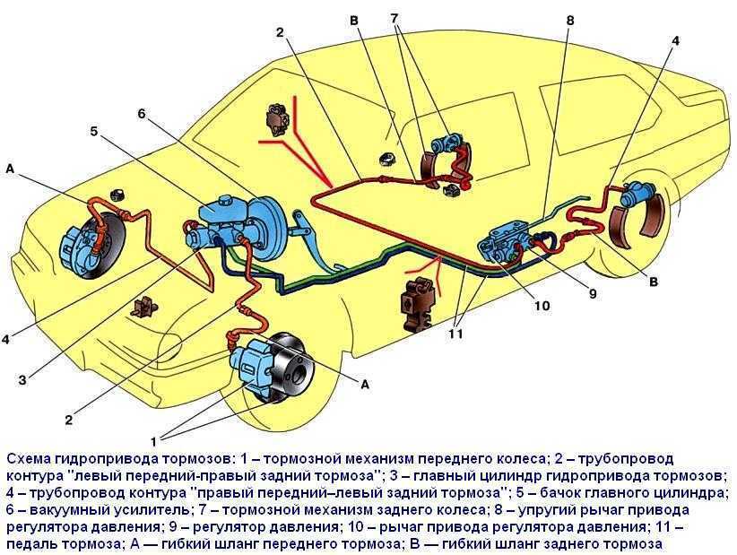 Каждый из контуров автомобиля включает в себя тормозные механизмы двух колес: одного переднего и одного заднего, расположенные на автомобиле по диагонали.
