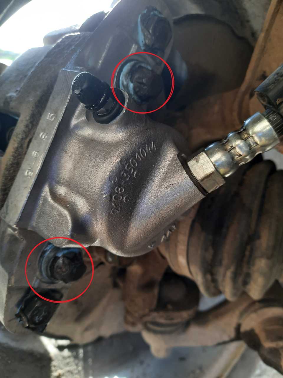 Далее собираем:—устанавливаем новый тормозной цилиндрик болтами торекс (Винт крепления цилиндра тормоза к суппорту М12х1,25, момент затяжки 95,9–118,4 (9,8–12,1))—устанавливаем суппорт (скобу) на машину (Болт крепления направляющей колодки к поворотному кулаку М10х1,25 момент затяжки 29,1–36 (2,97–3,67))—устанавливаем колодки—устанавливаем тормозной цилиндр и прикручиваем направляющие (Болт крепления направляющего пальца к цилиндру М8 момент затяжки 31–38 (3,16–3,88))—прикручиваем шланг
