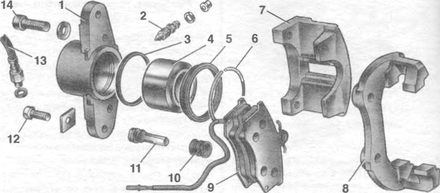 Рис. 6-22. Детали тормозного механизма переднего колеса: 1 — колесный цилиндр; 2 — штуцер для прокачки привода тормоза; 3 — уплотнительное кольцо; 4 — поршень; 5 — защитный колпачок; 6 — стопорное кольцо; 7 — суппорт; 8 — направляющая колодок; 9 — тормозные колодки; 10 — защитный чехол; 11 — направляющий палец; 12 — болт крепления направляющего пальца; 13 — тормозной шланг; 14 — болт крепления цилиндра к суппорту