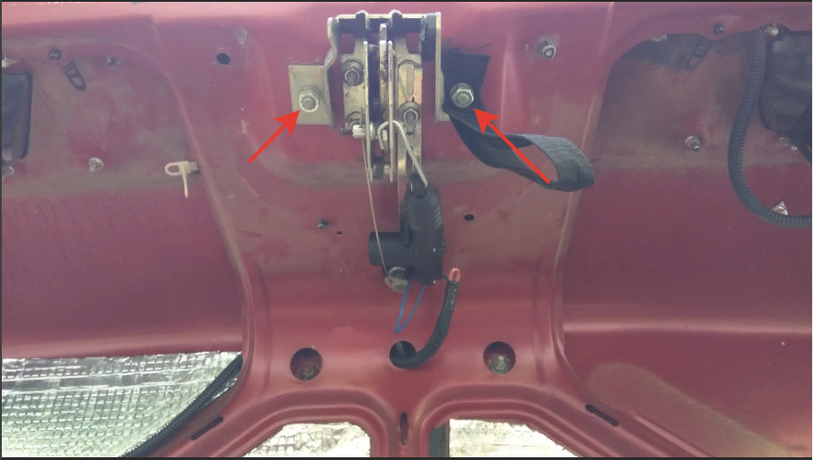 2) После того как обивка снята, выкрутите два болта и тем самым снимите замок с автомобиля, но только при выкручивании болтов, учитывайте тот факт что под одним из них располагаются несколько клемм, одна из которых идёт на моторедуктора стеклоочистителя двери задка, а другая на стоп-сигнал, ну и всё, замок снят с автомобиля.
