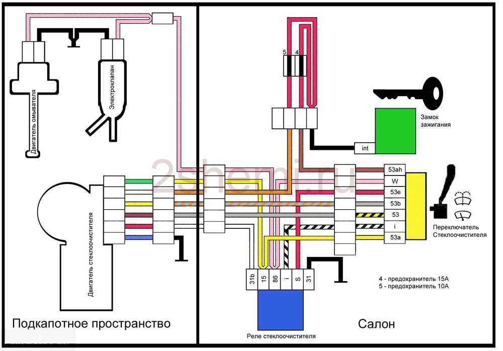 - «15» – вывод, через который подается напряжение в систему зажигания, на электрические двигатели отопителя, омывателя, приборную панель (двойной провод голубого цвета с черной полосой);